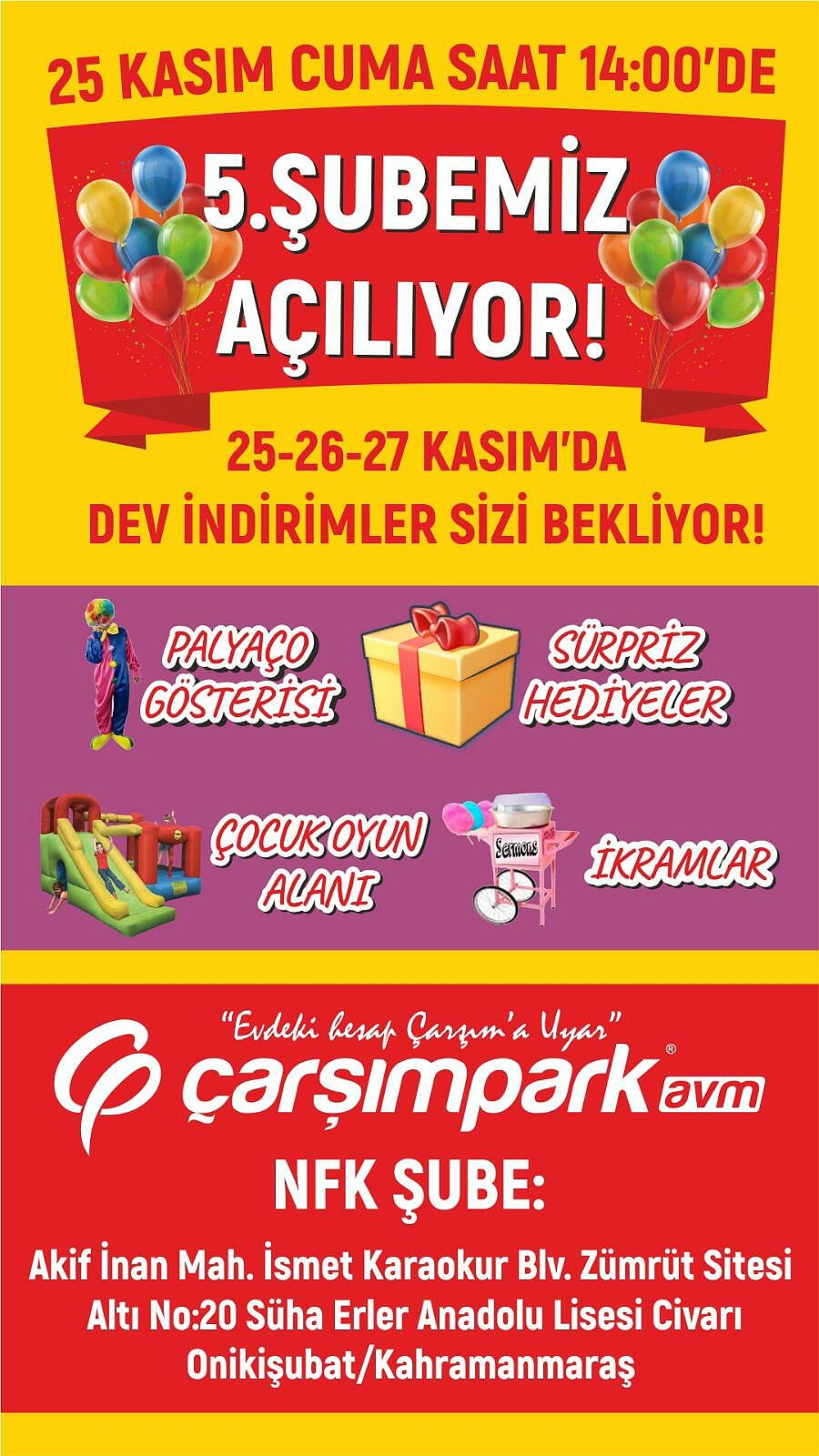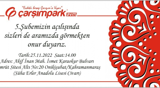 ÇARŞIM MAĞAZASI 5. ŞUBE AÇILIŞINA DAVETLİSİNİZÇarşım Mağazası Kahramanmaraş'ta 5. Şubesini açıyor.Açılış 25.11.2022 bugü(Cuma) günüdür. Açılışa bütün hemşehrilerimiz davetlidir.